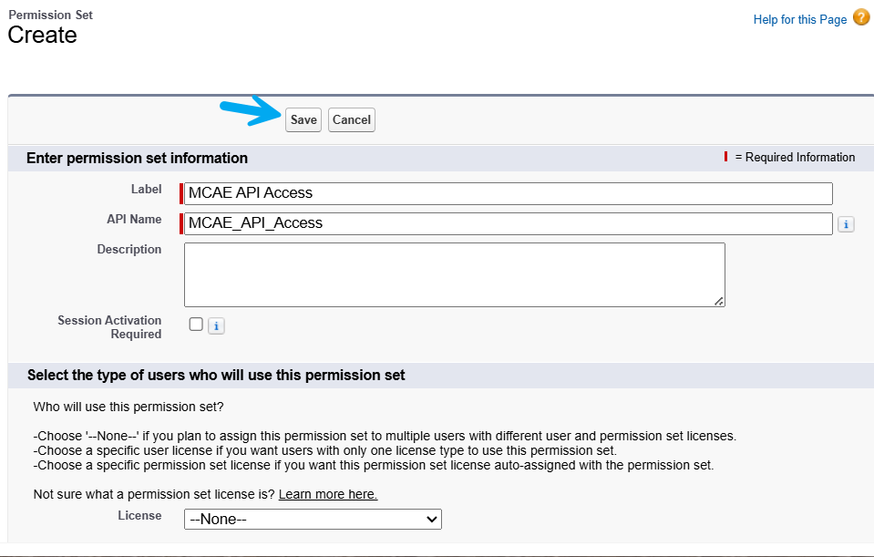 - Name: MCAE_API_Access_EC (this is the API name, and it doesn’t auto populate)
