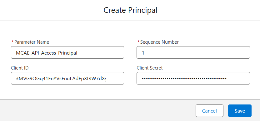 - Parameter Name: MCAE_API_Access_Principal (this is just the name we are giving this thing)