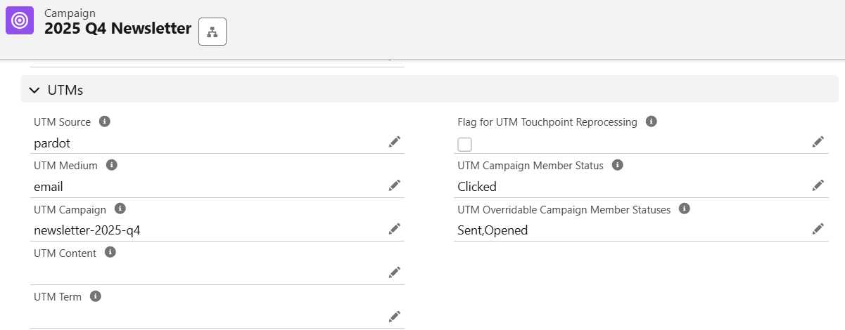 When a UTM Touchpoint record is created, the app tries to find the best matching Campaign based on the Parameters configured.